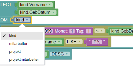 Lernende erhalten Einblick in eine visuelle Repräsentation der Datenbankstruktur und können SQL-SELECT-Statements mithilfe von Blöcken erstellen. Durch das puzzleartige Zusammensetzen der SQL-Blöcke werden Syntaxfehler minimiert.